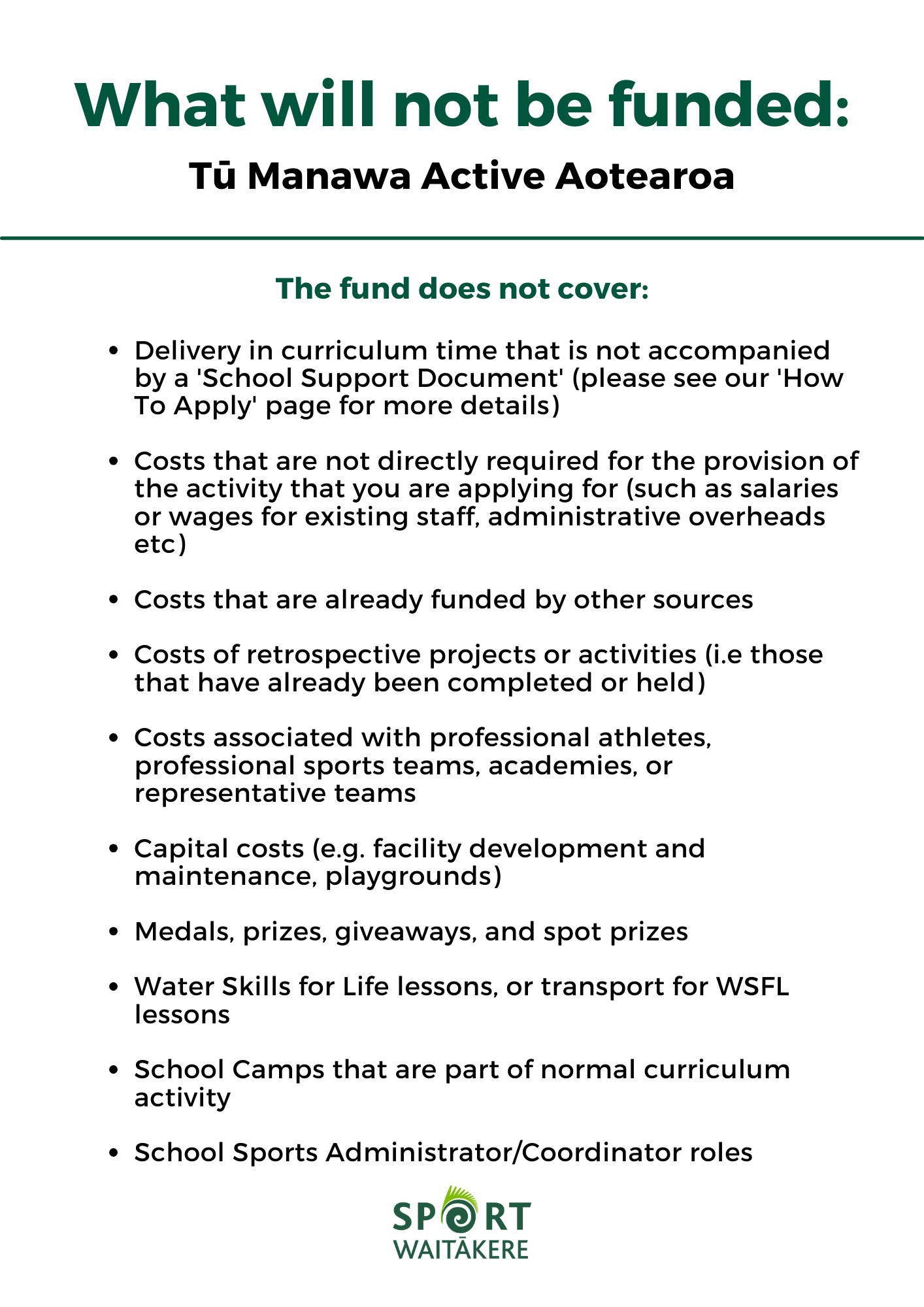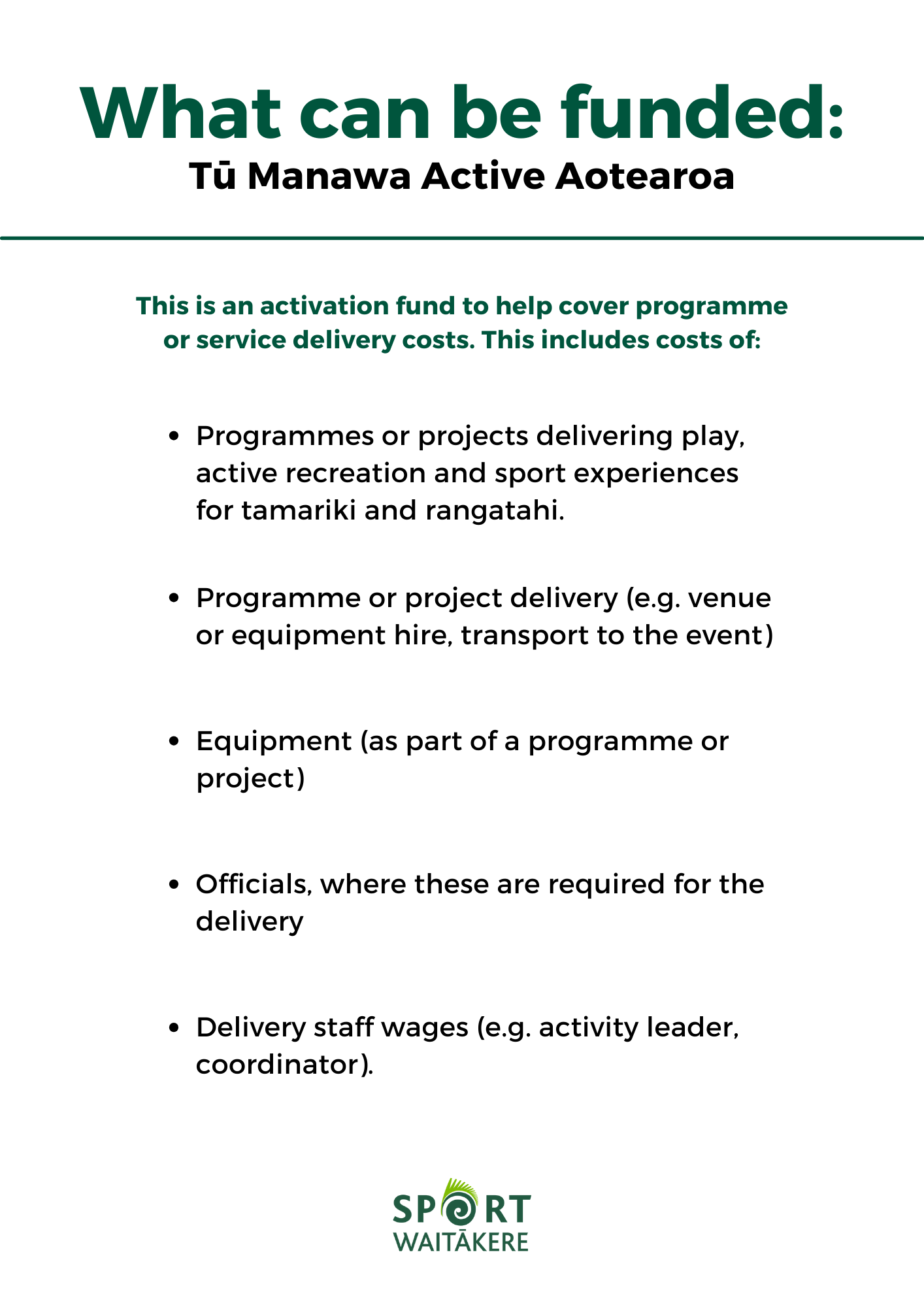 Tū Manawa Active Aotearoa is an activation fund that supports tamariki (5-11yrs), rangatahi (12-18yrs) and tāngata whaikaha (5-18 including those in school up to age 21) particularly those that are less active, to access quality play, active recreation and sport opportunities of their choice in their community, school or kura.